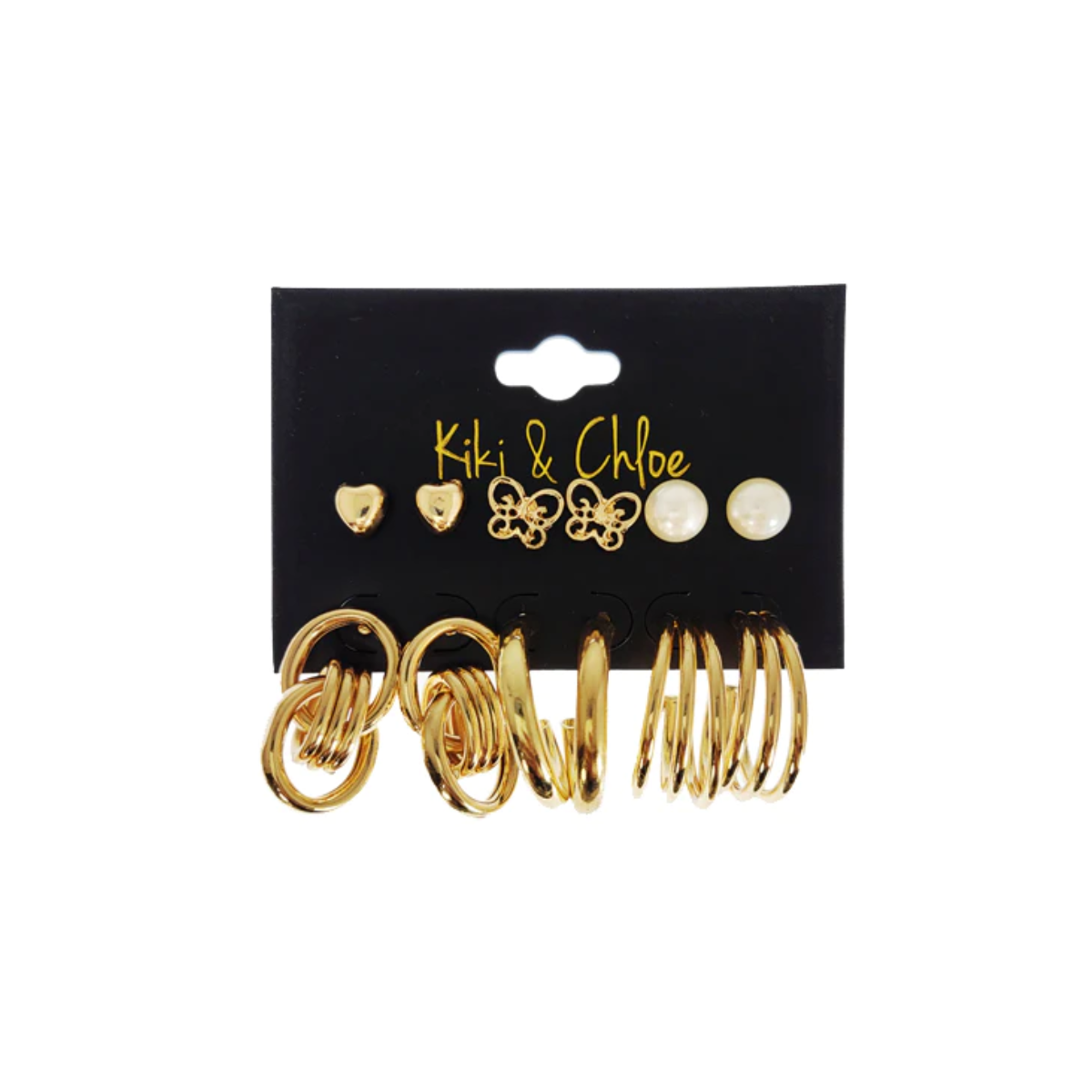 A six-piece set, blending the classic allure of studs with the modern charm of hoops, all under the Kiki & Chloe brand.