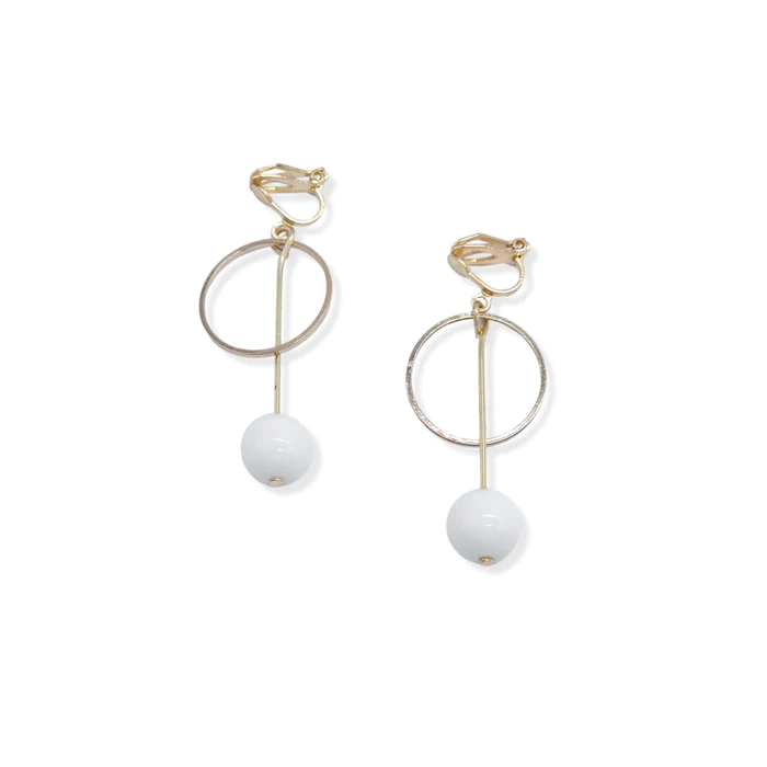 Gold clip-on earrings with a circle and stick design, adorned with white beads. A harmonious blend of geometric shapes and elegance.
