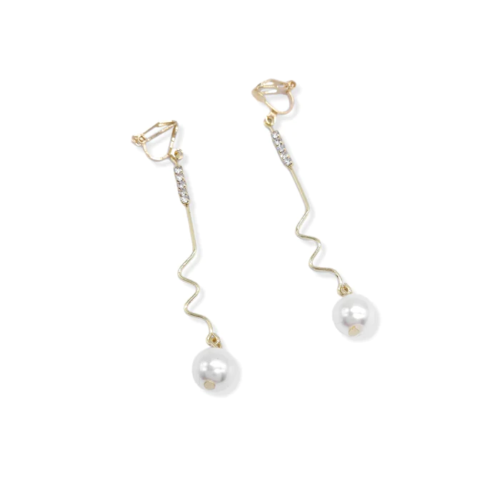 Unique clip-on earrings showcasing a twisted gold diamante bar, ending with a lustrous pearl. A modern twist on classic elegance.